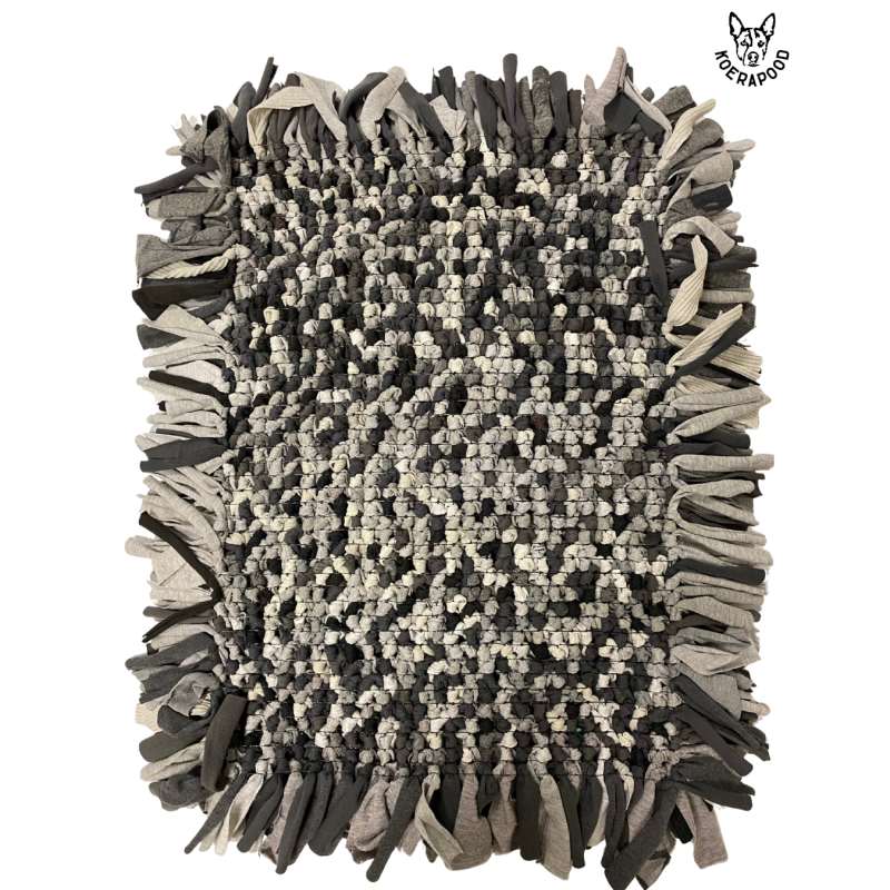 Nuuskimismati suurus ca 60cm x 50cm ja valmistatud taaskasutatud puuvillastest riideribadest, mis on punutud plastikust võrgule.