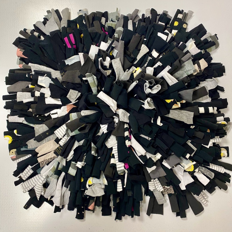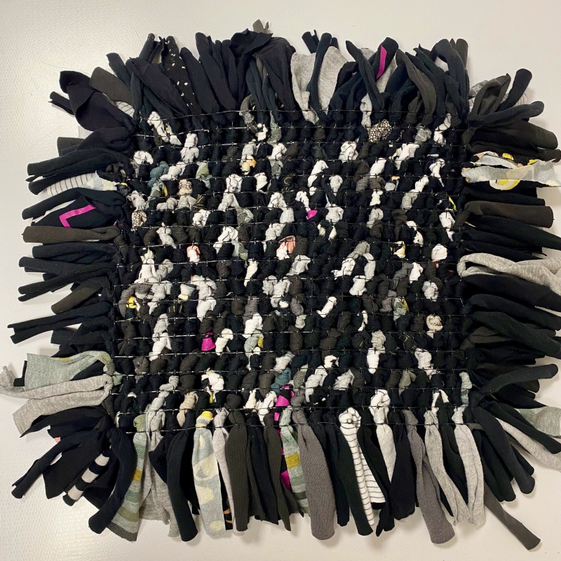 Nuuskimismati suurus ca 50x45 cm ja valmistatud taaskasutatud puuvillastest riideribadest, mis on punutud plastikust võrgule.