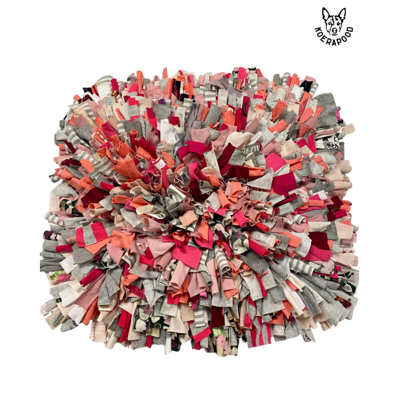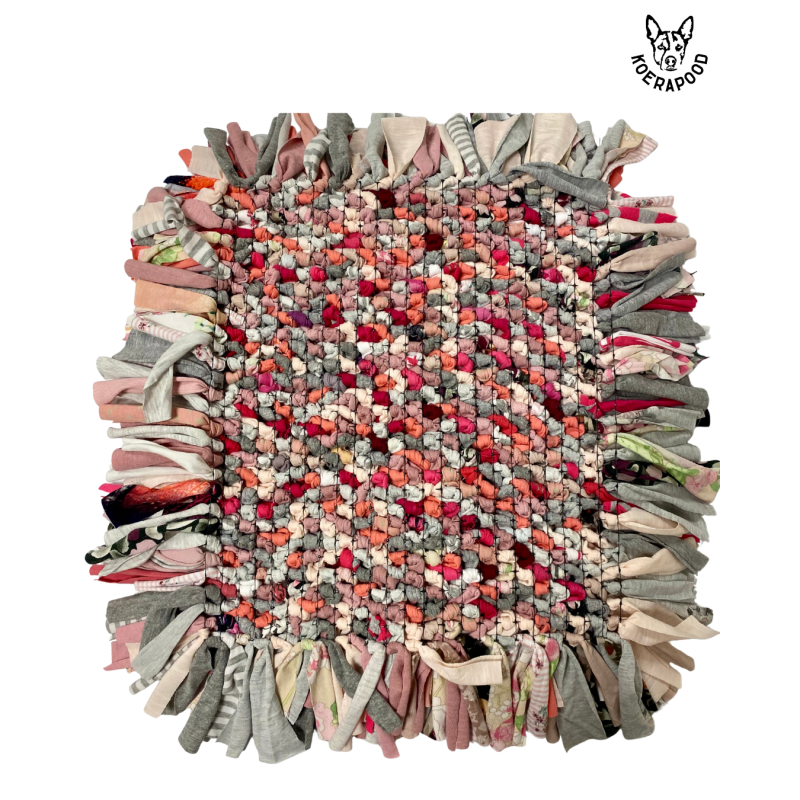 Nuuskimismati suurus ca 50x50cm ja valmistatud taaskasutatud puuvillastest riideribadest, mis on punutud tihedalt plastikust võrgule.