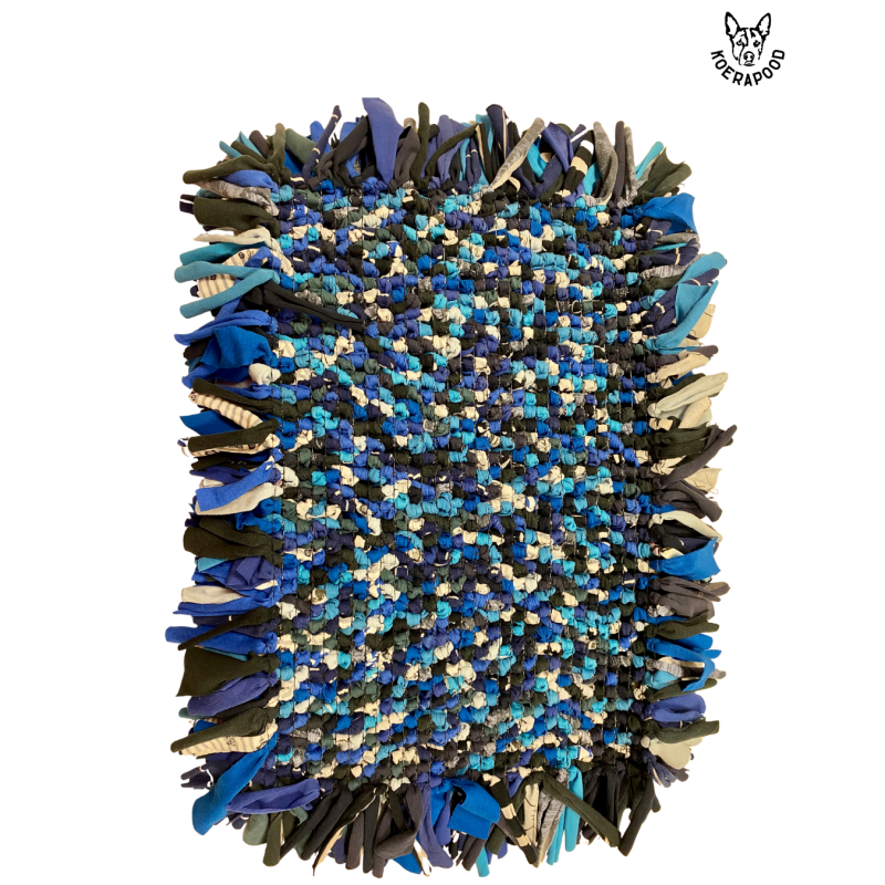 Nuuskimismati suurus ca 60x45cm ja valmistatud taaskasutatud puuvillastest riideribadest, mis on punutud tihedalt plastikust võrgule.